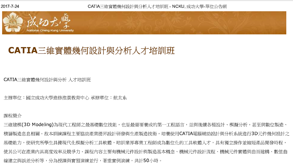 成功大學進修推廣教育中心開設規劃CATIA訓練課程,聘請最有經驗的教師講授,敬邀A-Team4.0聯盟會員報名參加。