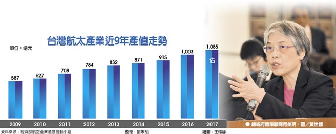 面對機械業今年產值可望破兆元,航太業產值也想破兆元。總統府國策顧問何美玥昨(5)日在「2017台灣航太產業與政策論壇」中表示,航太業去年度約1,003億元的產值,未來應該分兩階段成長,第一階段目標5,000億元,第二階段目標達兆元。