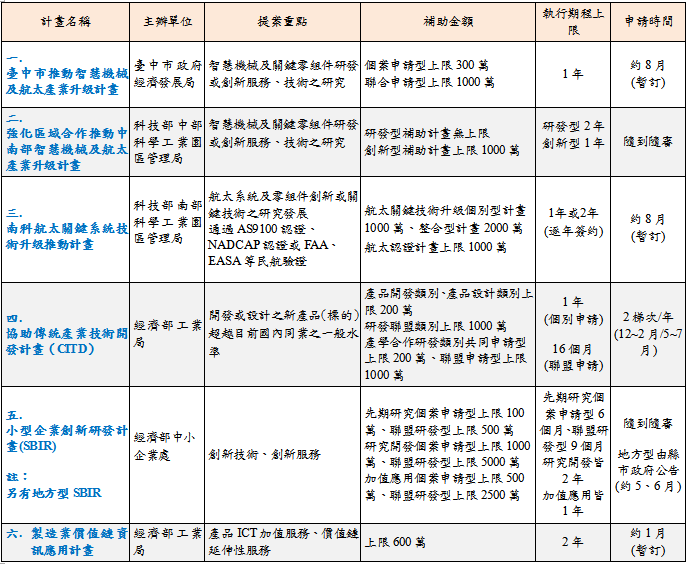 以下整理六大航太產業適用的政府補助計畫,建議 貴公司詳細閱讀。