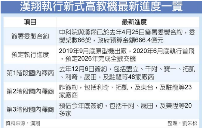 至於新式高教機第3階段釋商,漢翔擬將以高教機發動機零組件等供應商為主,預估漢翔目前發動機機匣協力廠商,包括千附實業及晟田科技等20多家均可入列,最快今年底簽約。 漢翔董事長廖榮鑫表示,新式高教機66架總預算約686億元,預定2019年9月底原型機出廠、2020年6月底執行首飛。