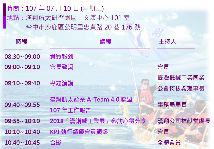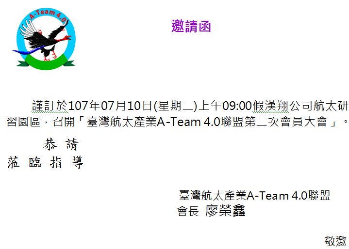 感謝您對「臺灣航太產業A-Team 4.0聯盟」的支持與肯定,謹訂於107年7月10日(星期二)上午09:00假漢翔公司航太研習園區舉辦「臺灣航太產業A-Team 4.0聯盟第二次會員大會」,會中除了進行兩個專題演講與A-Team 4.0聯盟107年度工作報告;另為獎勵會員認真執行KPI的成果,將於會中針對KPI執行績優會員進行頒獎。誠摯邀請您共同見證本聯盟為達成臺灣航太產業A-Team 4.0宗旨之里程碑。