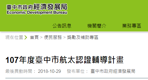 臺中市政府經濟發展局辦理臺中市航太認證輔導計畫,今年已邁入第二年,補助臺中市業者航太認證輔導費用,每家最高新臺幣十五萬元整。(每年六家為限)