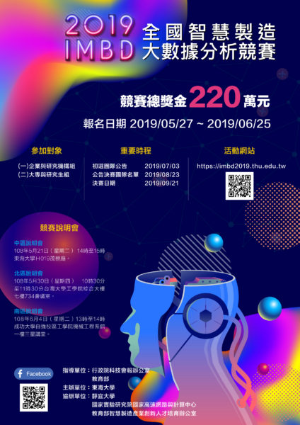 科技會報及教育部已於108年06月至09月舉行2019「全國智慧製造大數據分析競賽」活動,推廣「人工智慧與大數據分析」相關技術於智慧製造上之應用。今年度活動是由教育部與東海大學 主辦2019 「全國智慧製造大數據分析競賽」, 漢翔公司是贊助單位。其宗旨是為推廣「人工智慧」與「巨量數據分析」相關技術於智慧製造上之應用,並培植國內相關領域之人才,本競賽活動透過學界與產業界之合作,由業界提供實際製造或營運數據,做為競賽使用,供參與競賽之團隊分析,用以培植與發掘智慧製造與巨量數據分析之優秀人才。 2019 全國智慧製造大數據競賽的活動競賽辦法網址如下: https://imbd2019.thu.edu.tw/, 請參閱。在組別上,企業與研究機構可組隊參與相關競賽,歡迎A-TEAM 4.0成員踴躍報名,參加競賽。