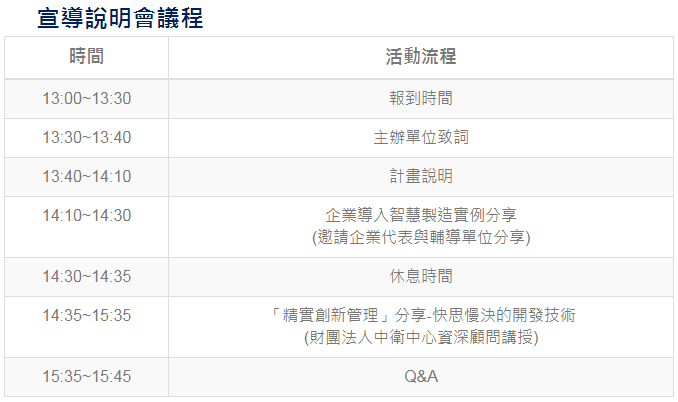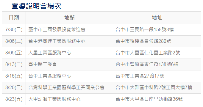 面對全球智慧化浪潮來臨,臺中市政府經濟發展局為協助臺中市中小企業掌握轉型契機,推出「臺中市機械產業智能升級計畫」。為使企業了解本計畫輔導資源與活動訊息,將自2019/07/30至2019/08/23辦理七場「宣導說明會」,除分享計劃訊息外,會中另特別安排「企業導入智慧製造實例」與「精實創新管理-快思慢活的開發技術」分享。