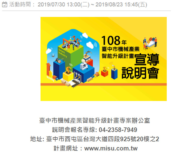 【敬邀出席】108年臺中市機械產業智能升級計畫宣導說明會