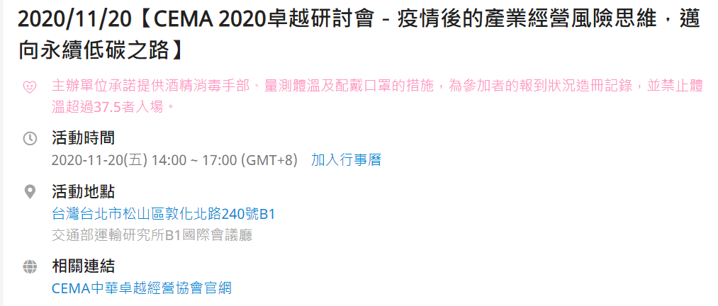 舉辦CEMA「2020卓越研討會 - 疫情後的產業經營風險思維,邁向永續低碳之路」活動,