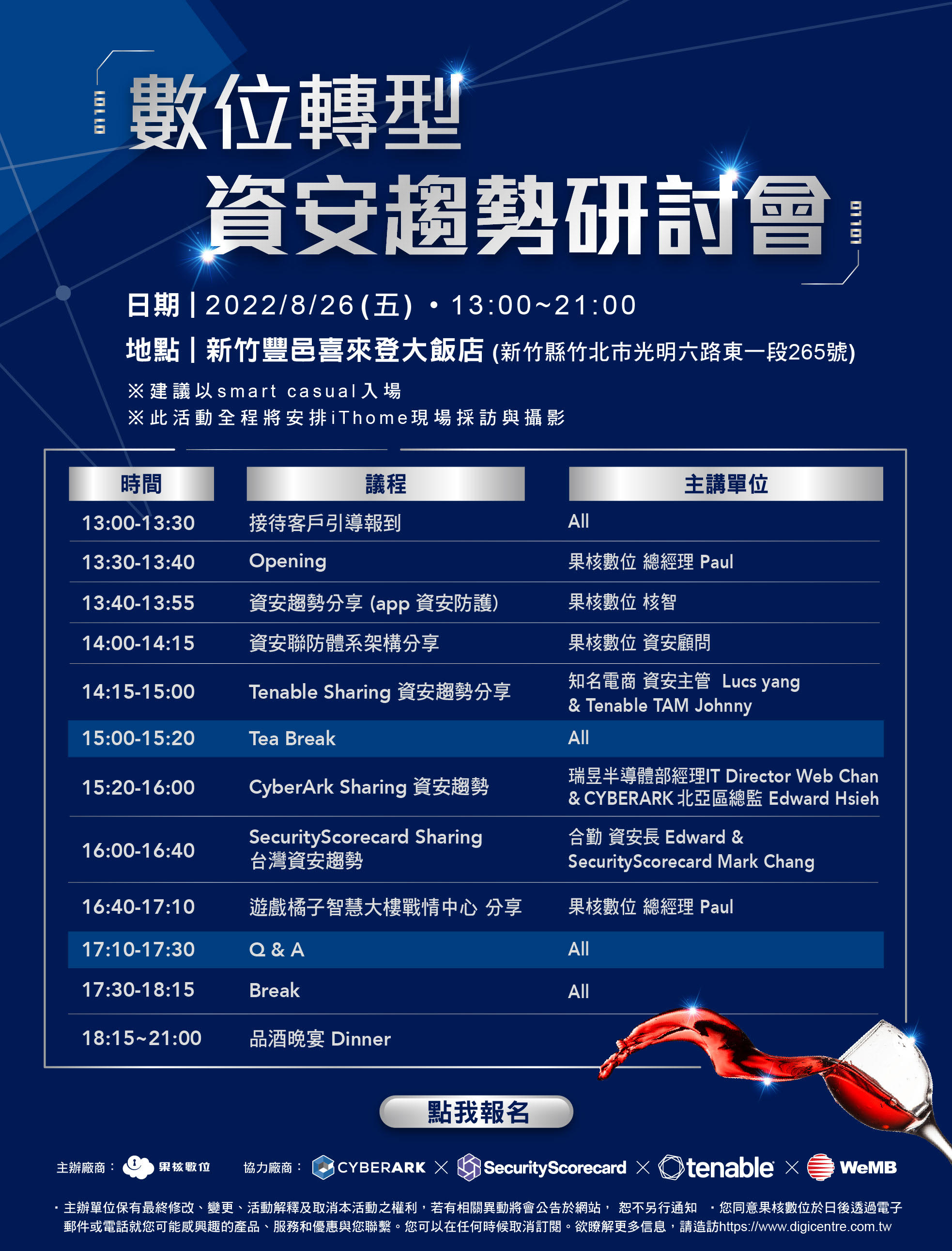 果核數位將於2022/08/26於新竹豐邑喜來登大飯店舉辦資安研討會,將邀請多位企業CIO/CISO及國內外資安品牌原廠一同參與分享及討論,包括Tenable、SecurityScorecard 、CyberArk等!