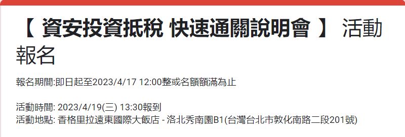 報名期間: 即日起至2023/4/17 12:00整或名額額滿為止