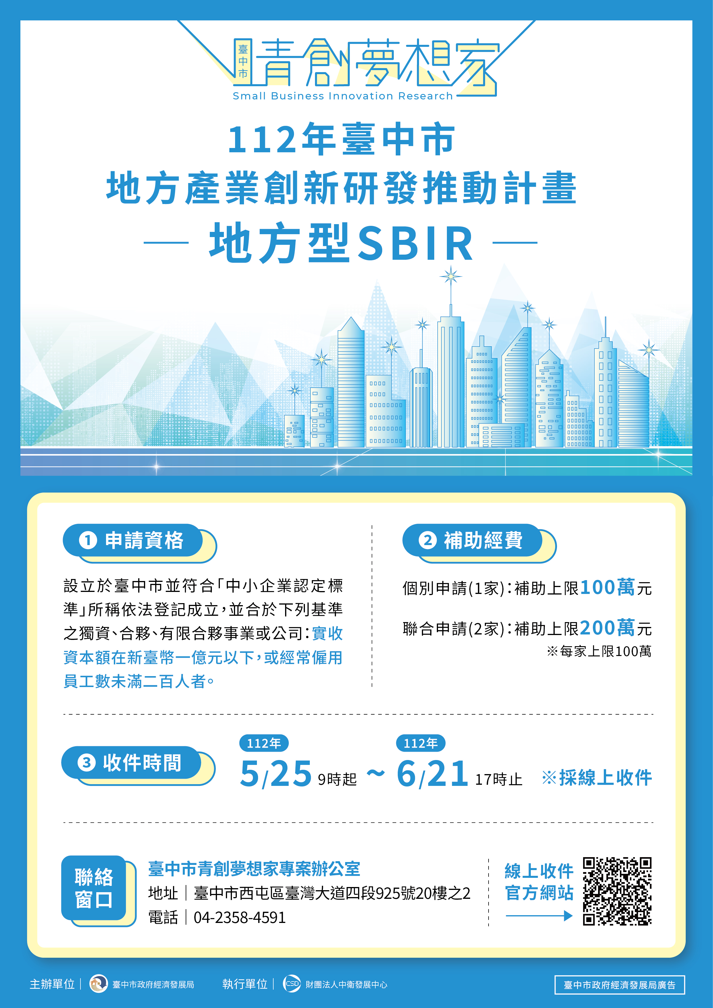 今年度(112)線上受理期間自112年05月25日(星期四)09時至112年06月21日(星期三)17時止,採線上申請,請申請業者備妥並確認資料齊全後,於臺中市青創夢想家計畫網站(https://youth-taichung.com.tw [youth-taichung.com.tw])「SBIR專區」進入報名系統填寫並上傳申請資料,受理時間以申請系統收受時間認定,逾期報名或紙本寄送報名資料者不予受理。(詳細申請須知請參閱計畫官方網站公告,或洽青創夢想家專案辦公室04-2358-4951)