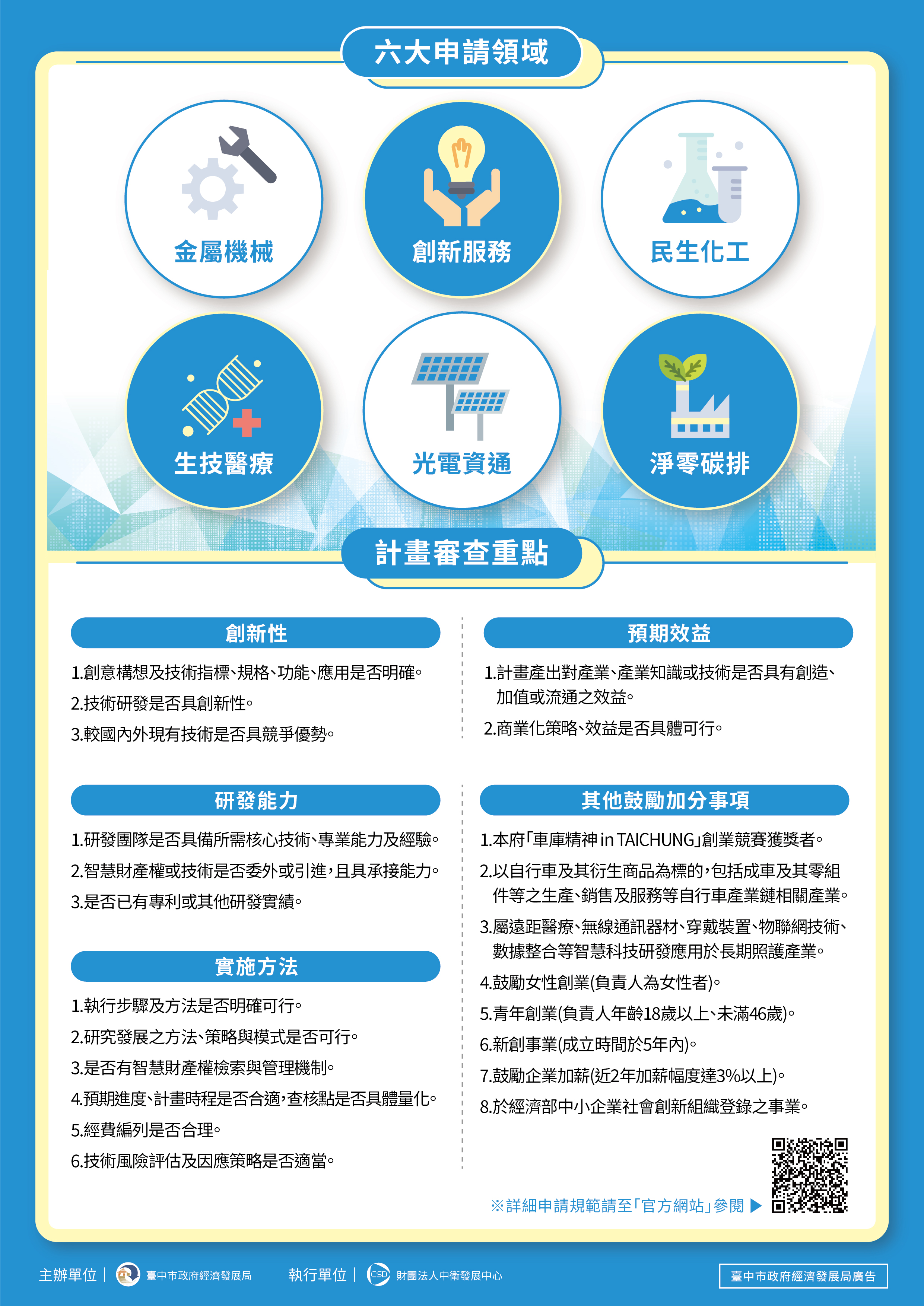 112年臺中市地方型SBIR即將開始受理收件,專案辦公室針對計畫申請辦理3場次宣導說明會 (5/25、6/2及6/7下午14:00開始),除了申請作業流程外,以金屬機械、創新服務、光電資通領域為例進行計畫撰寫說明,協助企業掌握申請重點,歡迎欲提出申請的企業先進參加,宣導說明會報名請點選連結(https://course-plan.csd.org.tw/activitys/items?id=476 [course-plan.csd.org.tw])。