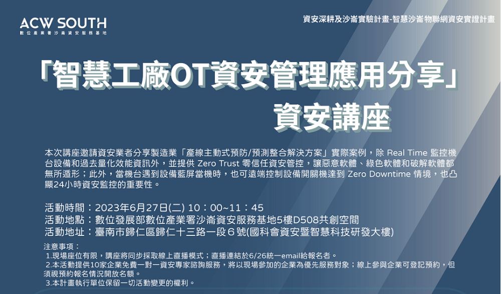 為協助會員提高資安防護能力,持續為會員準備資安相關訊息(例 : 資安研討會、講座 ...等) ,台中市電腦公會於6/27 舉辦「智慧工廠OT資安管理應用分享」線上/實體課程,提供更多元資安資源,課程完全免費,敬邀會員踴躍上網報名參加。