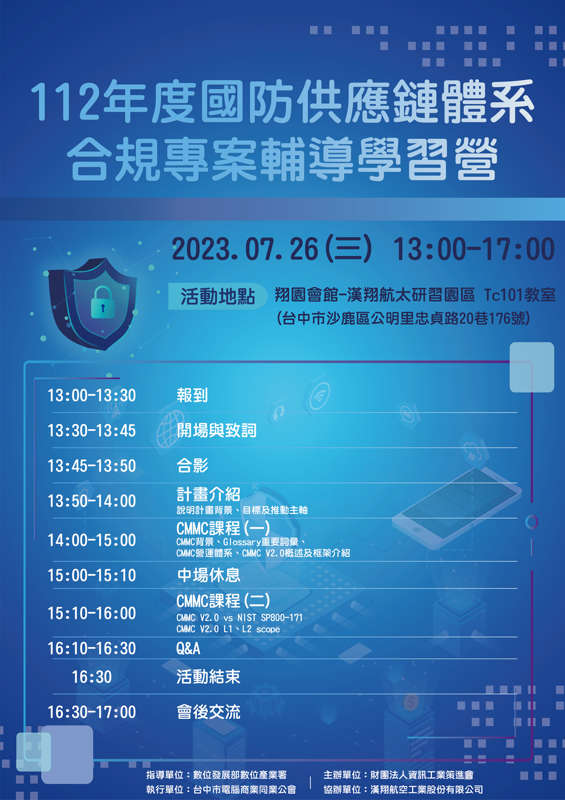 歡迎報名7/26國防產業CMMC輔導計畫說明會「112年度國防供應鏈體系合規專案輔導學習營」