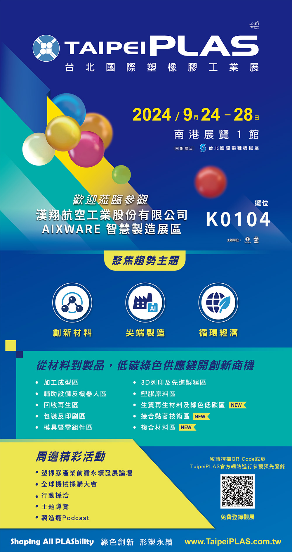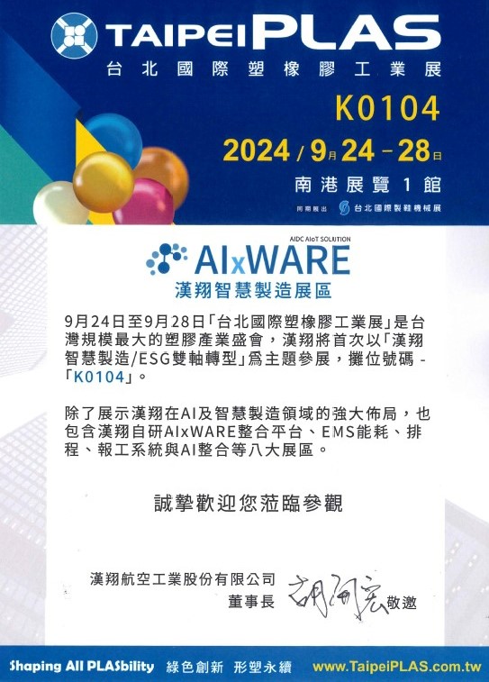 漢翔公司胡董事長誠摯地邀請您於2024年9月24日至9月28日,蒞臨台北國際塑橡膠工業展(TaipeiPLAS),參觀漢翔航空智慧製造AIxWARE展位(攤位編號:K0104),一同探索我們在AI智慧製造與ESG雙軸轉型方面的創新進展。
